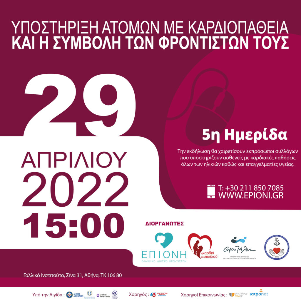 Η ΕΠΙΟΝΗ σε συνεργασία με τις οργανώσεις “η Καρδιά του Παιδιού”, “Σκυτάλη” και της “Ένωσης Καρδιοπαθών Αξιωματικών Π.Ν. – Λ.Σ. και Φίλων” θα πραγματοποιήσει την Παρασκευή 29 Απριλίου 2022, στις 15:00, την 5η ενημερωτική εκδήλωση – υβριδική ημερίδα με θέμα “Υποστήριξη ατόμων με καρδιοπάθεια και η συμβολή των φροντιστών τους”.