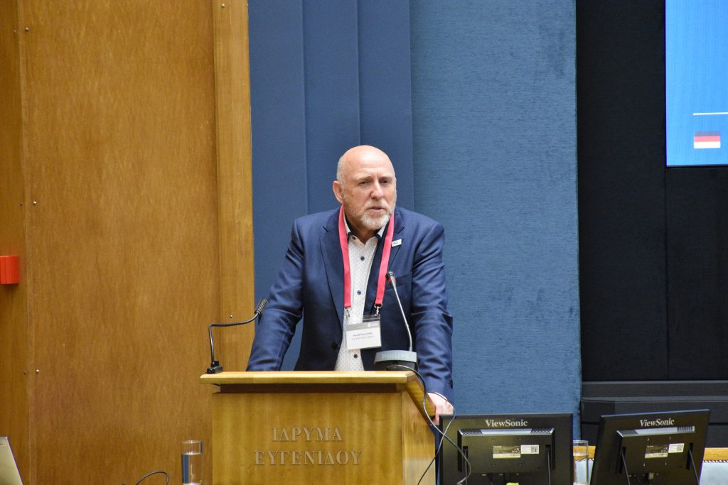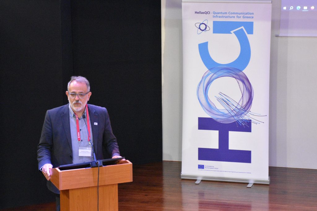 Dr. Ilias Papastamatiou, senior Project Manager at GRNET and HellasQCI Project Coordinator, after the welcoming speeches, gave an overview of the EuroQCI initiative and the HellasQCI project and moderated the 1st panel of the conference which was consisted of  key players from public and private sectors (GRNET – Dr. Ilias Papastamatiou,  NOA – DrHaris Kontoes, Motor Oil Group – Mr. Panagiotis Georgiou and  Lasting Software – MrDaniel Zirmer) as early adopters of the new emerging technologies on quantum and optical communications.